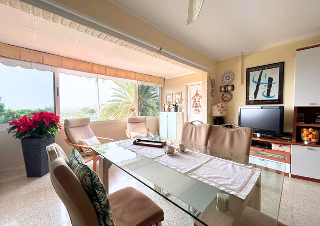 El apartamento cuenta con una amplia y acogedora sala de estar y comedor, que ha sido ampliada gracias a la terraza, creando un ambiente abierto y aireado perfecto para relajarse o recibir visitas. Disfrute de vistas parciales al mar desde la comodidad de su hogar, llevando la serena sensación del océano hasta su puerta.
